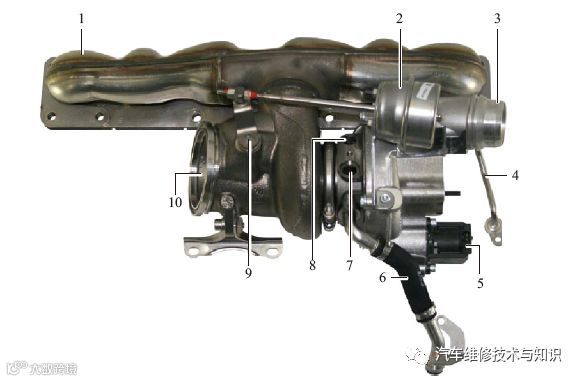 1—废气旁通阀;2—废气旁通阀杠杆臂;3—废气旁通阀真空罐;4—循环空气减压阀;5—机油回流管路;6—冷却液回流管路;