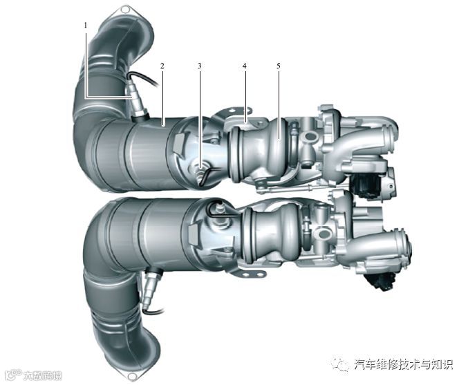 1—氧传感器(催化转换器后的监控传感器);2—催化转换器;3—氧传感器(催化转换器前的监控传感器);4—排气歧管;5—废气涡轮增压器