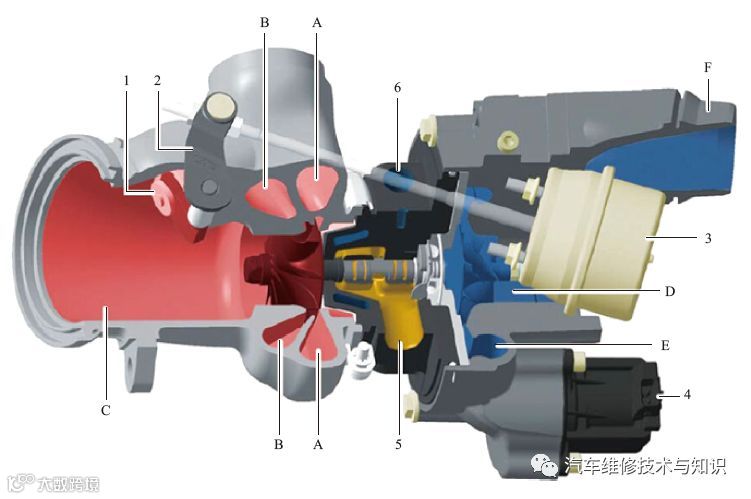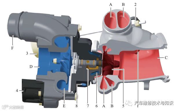 A—废气通道1(气缸1~3);B—废气通道2(气缸4~6);C—至催化转换器的接口;D—自进气消声器的入口;E—环形通道;F—至增压空气冷却器的出口