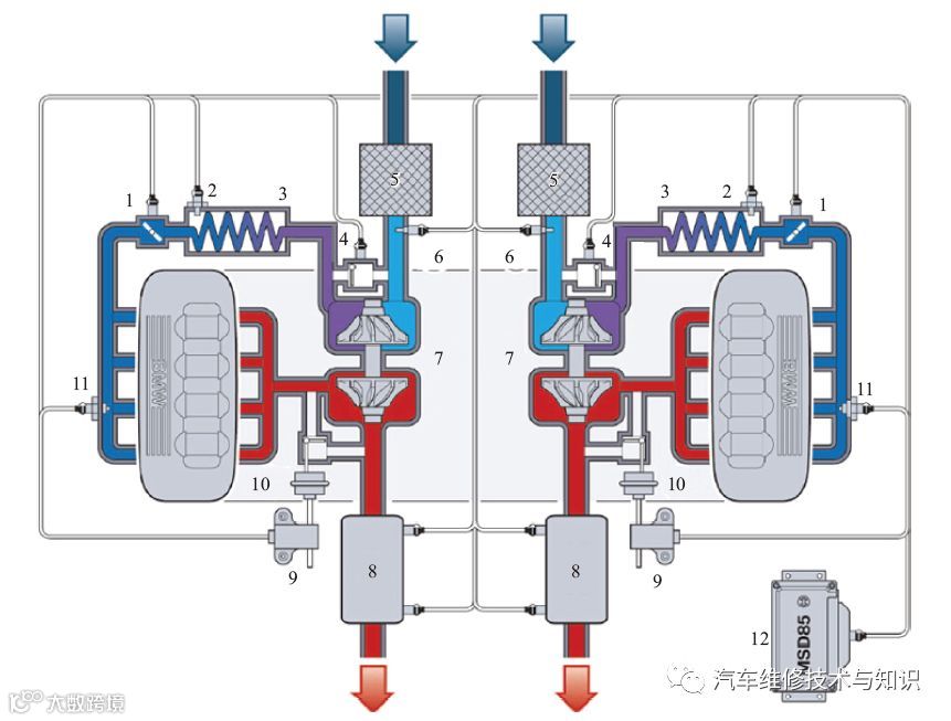 1—节气门;2—增压空气温度和压力传感器;3—增压空气冷却器;4—循环空气减压阀;5—进气消声器;6—热膜式空气质量流量计;7—废气涡轮增压器;8—催化转换器;9—电子气动压力转换器;10—废气旁通阀;11—进气管压力传感器;12—数字式发动机电子系统