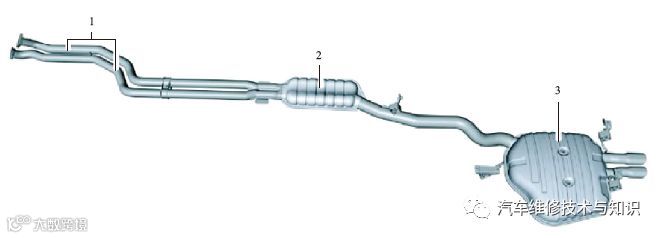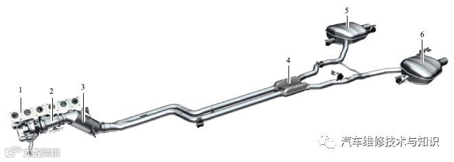 1—排气歧管;2—废气涡轮增压器;3—催化转换器;4—中间消声器;5—右后消声器;6—左后消声器
