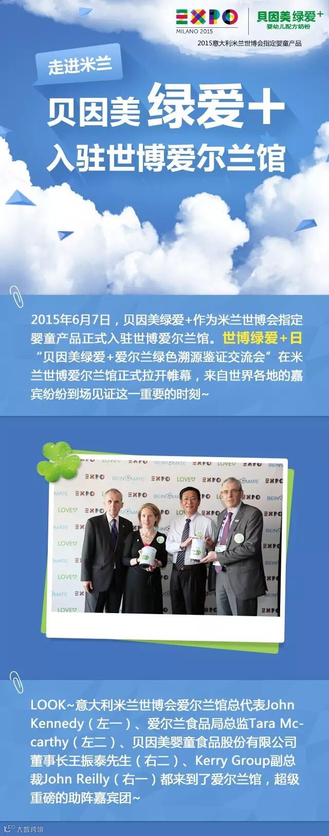 【世博绿爱+日】“贝因美绿爱+爱尔兰绿色溯源鉴证交流会”在米兰世博爱尔兰馆正式拉开帷幕,来自世界各地的嘉宾纷纷到场见证这一重要的时刻~
