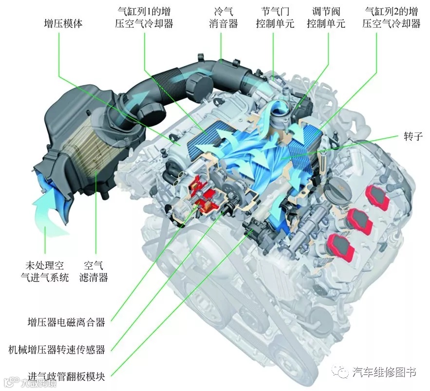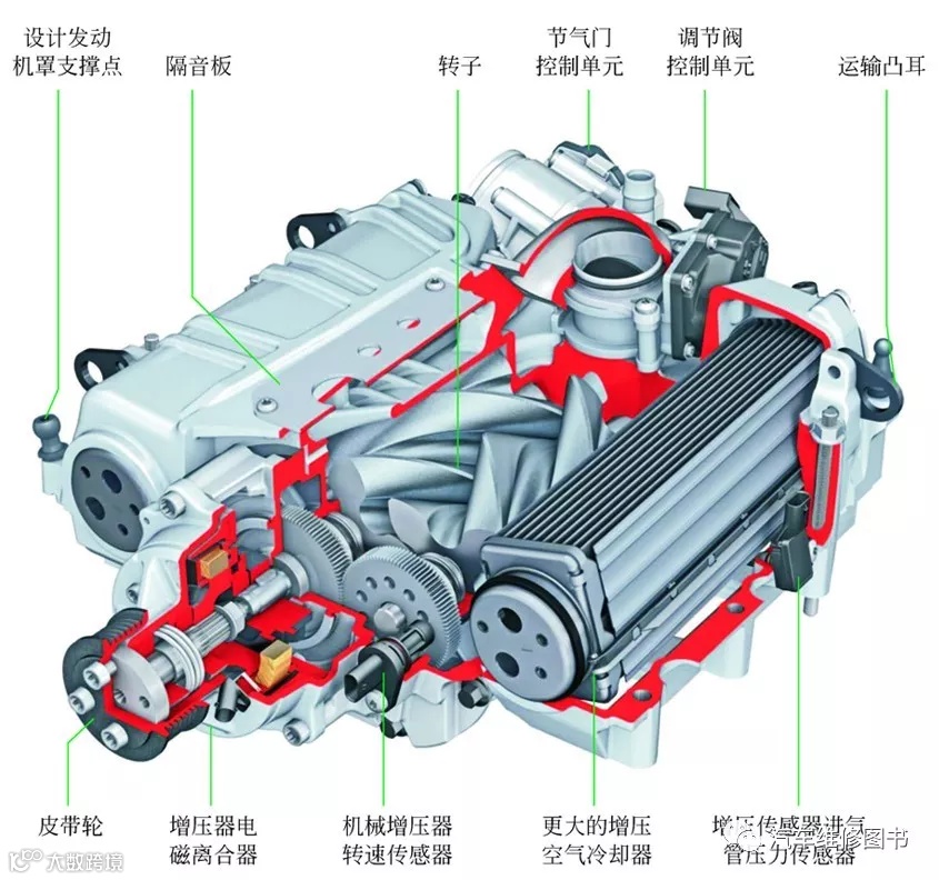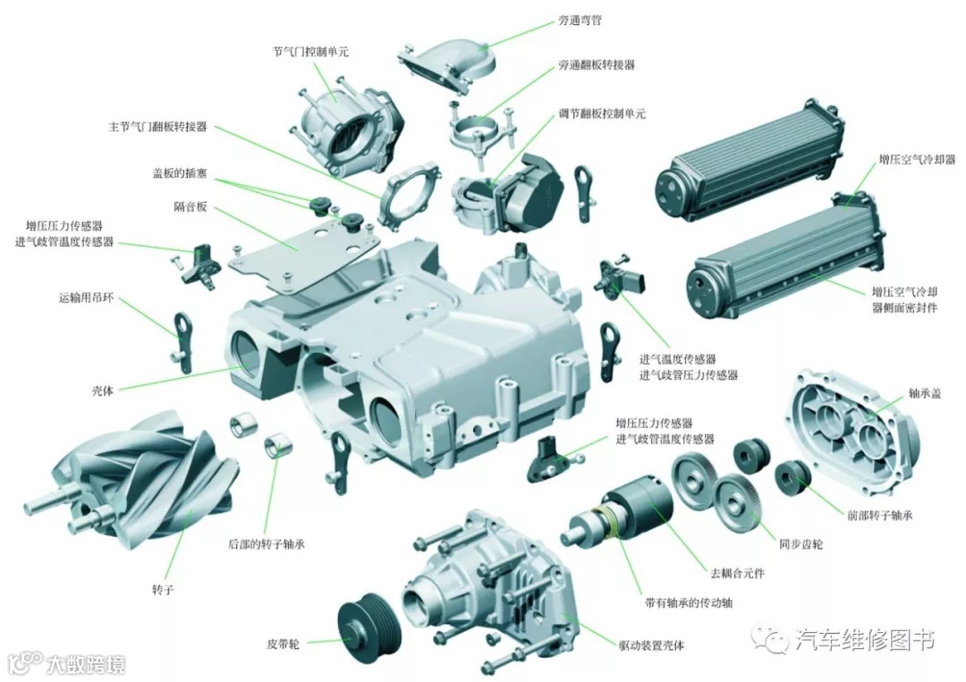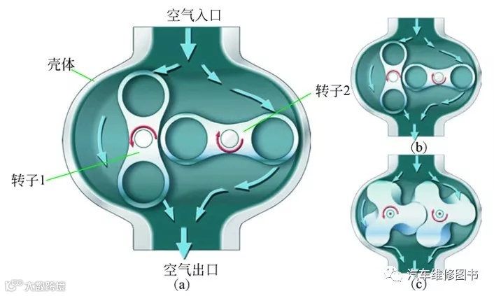 机械增压器本质上是一台罗茨鼓风机,有两个转子或三个,每个转子都扭转一定的角度,以形成一个螺旋。这两个或三个转子都由发动机曲轴通过皮带驱动,与废气系统不相干。