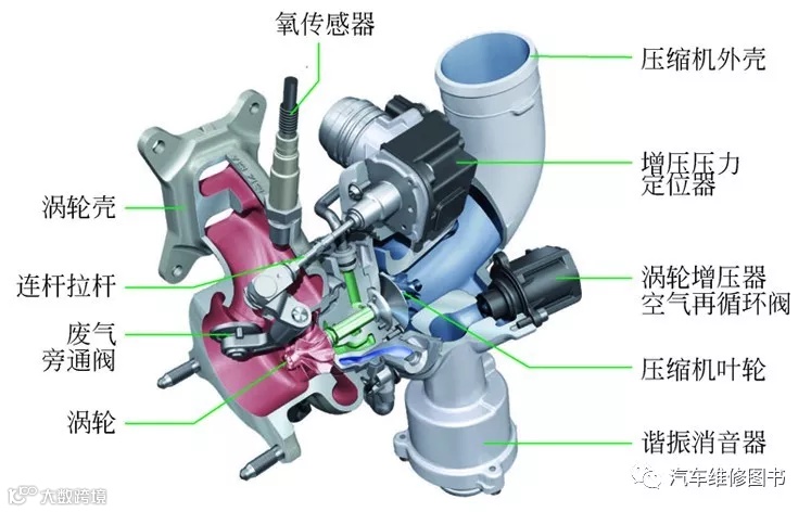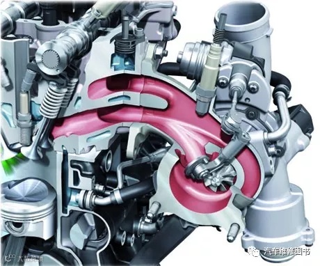 废气涡轮增压系统利用发动机排出的废气惯性冲力来推动涡轮室内的涡轮,涡轮又带动同轴的叶轮,叶轮压送由空气滤清器管道送来的空气,使之增压进入气缸。增压器与发动机无任何机械联系,实际上是一种空气压缩机,通过压缩空气来增加进气量。
