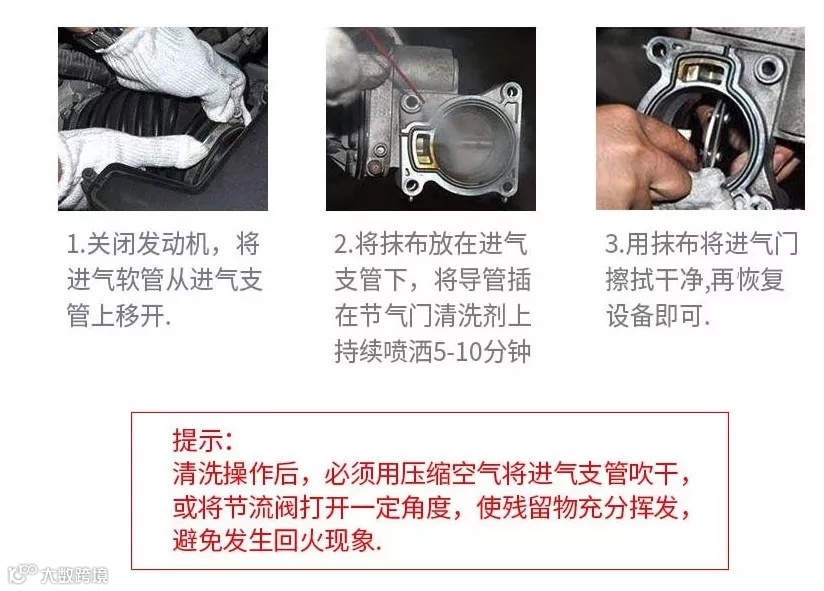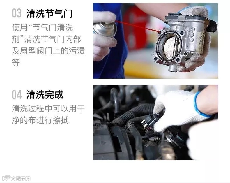 o 【温柔手段】:把清洗剂喷在节气门上用抹布去擦拭。或将清洗剂倒在抹布上,去擦拭节气门;