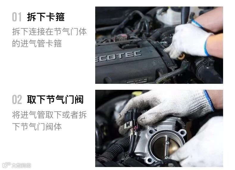 先来说「拆解节气门清洗」,其原理非常好理解,就是把节气门整个拆下来,然后进行清洗,其基本的步骤大致如此: