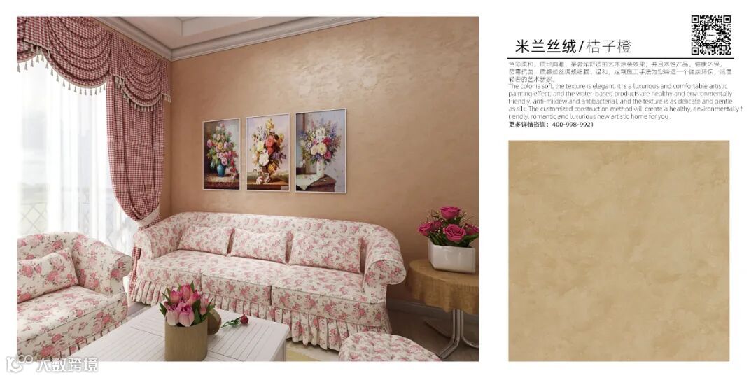 米兰丝绒:漆色彩柔和,质地典雅,是奢华舒适的艺术涂装效果;并且水性产品,健康环保,防霉抗菌,质感如丝绸般细腻、温和,定制施工手法为您缔造一个健康环保,浪漫轻奢的艺术新家。