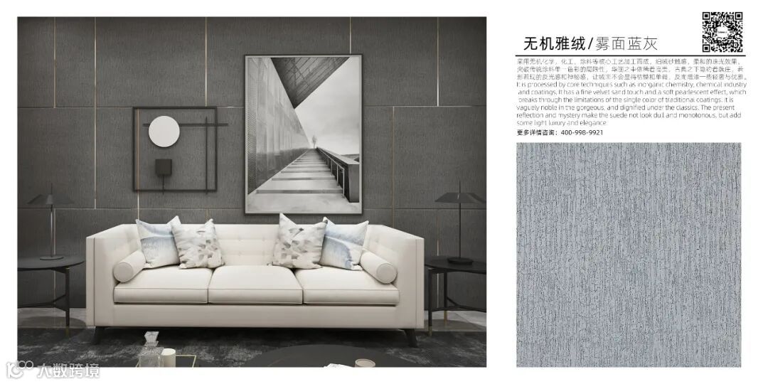 无机雅绒:采用无机化学,化工,涂料等核心工艺加工而成,细绒砂触感,柔和的珠光效果,突破传统涂料单一色彩的局限性,华丽之中依稀着高贵,古典之下隐约着端庄,若影若现的反光感和神秘感,让绒面不会显得枯燥和单调,反而增添一些轻奢与优雅。