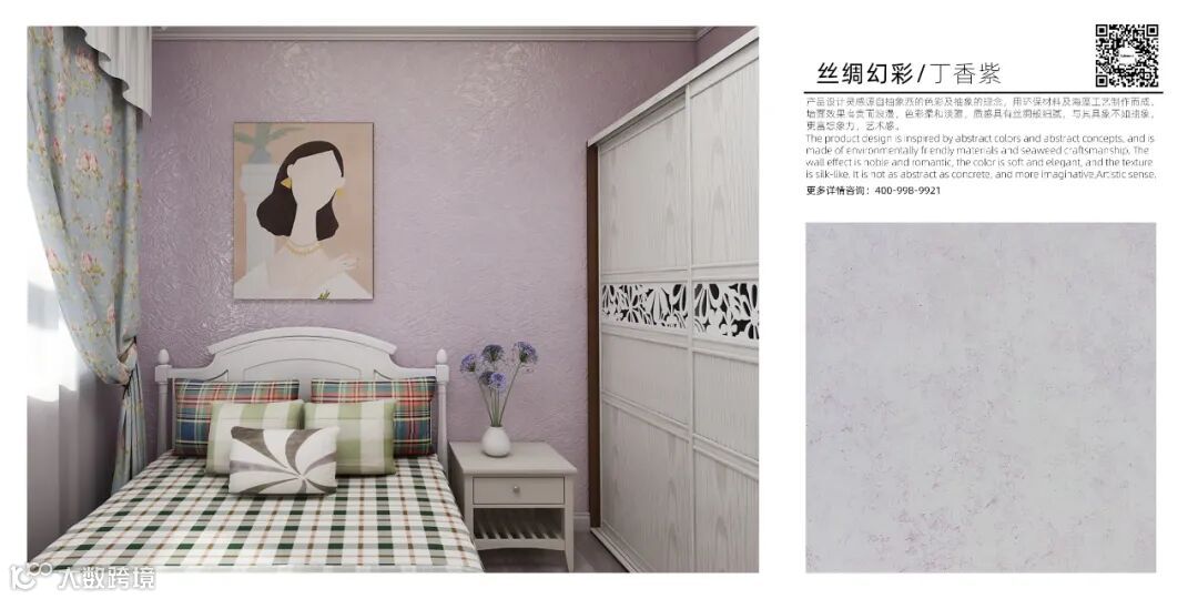 丝绸幻彩:产品设计灵感源自抽象派的色彩及抽象的理念,用环保材料及海藻工艺制作而成,墙面效果高贵而浪漫,色彩柔和淡雅,质感具有丝绸般细腻,与其具象不如抽象,更富想象力,艺术感。