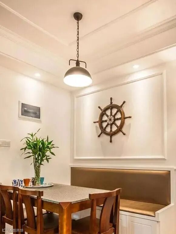 美式风格的餐厅装修,餐厅墙面装饰除了装饰画,也可以悬挂一些比较另类的装饰挂件来彰显出装修风格的特点。