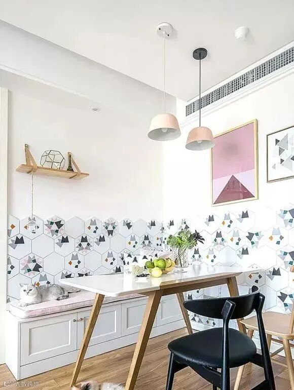 餐厅位置的墙面可以利用六边形的瓷砖来装饰,带图案的瓷砖能够营造出更有个性的用餐氛围。餐桌餐椅是餐厅中不可缺少的家具,要根据不同的风格来选择合适的餐桌餐椅。