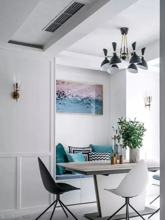 现代北欧风的餐厅装修,白色的空间里,配上灰色的餐桌,再搭配白色或者黑色的简易餐椅,极具设计感的视觉效果让餐厅显得特别惬意。