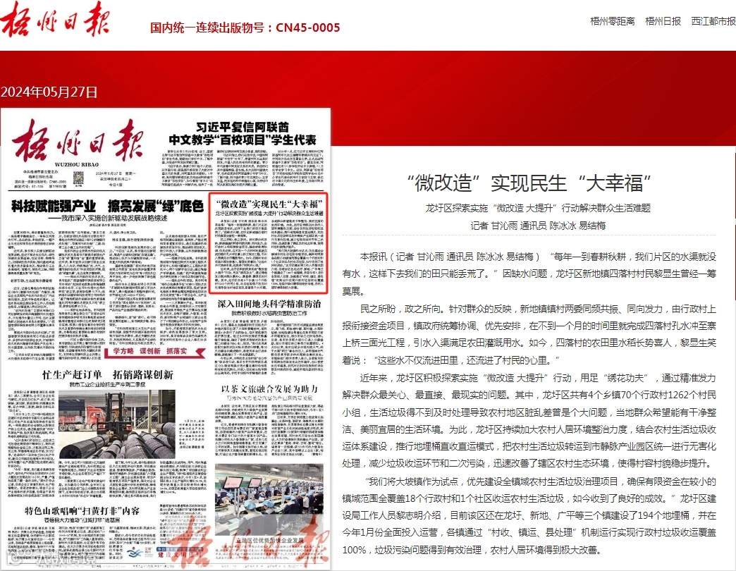 近年来,龙圩区积极探索实施“微改造 大提升”行动,用足“绣花功夫”,通过精准发力解决群众最关心、最直接、最现实的问题。其中,龙圩区共有4个乡镇70个行政村1262个村民小组,生活垃圾得不到及时处理导致农村地区脏乱差曾是个大问题,当地群众希望能有干净整洁、美丽宜居的生活环境。为此,龙圩区持续加大农村人居环境整治力度,结合农村生活垃圾收运体系建设,推行地埋桶直收直运模式,把农村生活垃圾转运到市静脉产业园区统一进行无害化处理,减少垃圾收运环节和二次污染,迅速改善了辖区农村生态环境,使得村容村貌稳步提升。