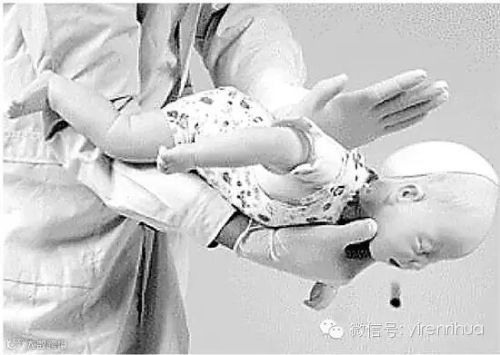 潘医生说,还有个办法:马上把孩子抱起来,一只手捏住孩子颧骨两侧,手臂贴着孩子的前胸,另一只手托住孩子后颈部,让其脸朝下,趴在救护人膝盖上。在孩子背上拍1到5次,看孩子是否将异物吐出。