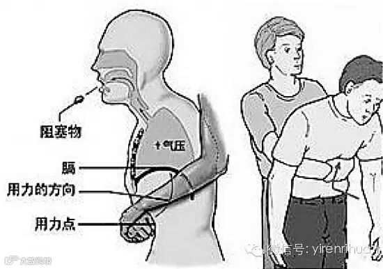 应用于急救成人。抢救者站在病人背后,用两手臂环绕病人的腰部,然后一手握拳,将拳头的拇指一侧放在病人胸廓下和脐上的腹部。再用另一手抓住拳头、快速向上重击压迫病人的腹部。重复以上手法直到异物排出。
