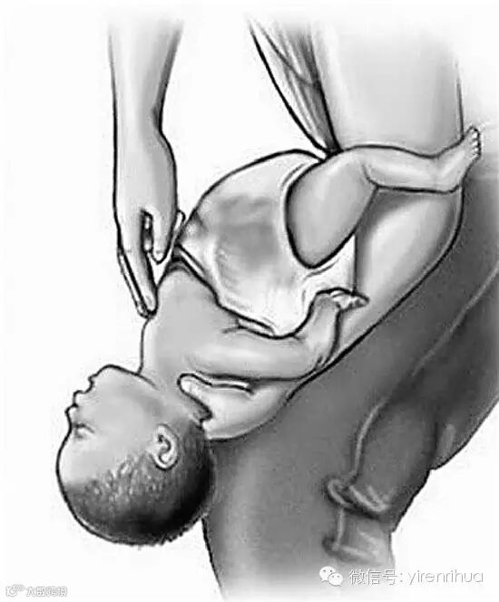 如上述操作无效,可把孩子翻过来,躺在坚硬的地面或床板,抢救者跪下或立于其足侧,或取坐位,并使患儿骑在抢救者大腿上,面朝前。抢救者以两手中指或食指,放在患儿胸廓下和脐上的腹部,快速向上重击压迫,但要轻柔,直至异物排出。
