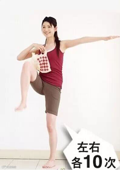 首先用右手的食指与中指拿着塑料袋的挽手处,手肘向右弯曲,手臂抬起,左臂向左伸直平举,同时左腿站直,右膝抬高,小腿与大腿稍微收紧,左右各做10次,令股关节周围的肌肉活动起来,分解厚积的脂肪。