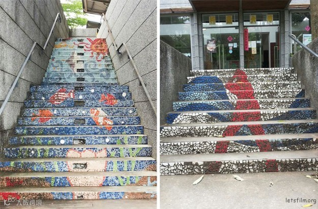 台东县泰源国中,美术课的刘秀霞老师带着三届不同的学生做的阶梯马赛克。
