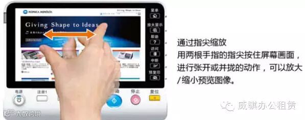 柯尼卡美能达 C224e彩色复合机用户界面采用与智能手机等类似的多点触控操作方式,在触摸屏上能够用多种手势动作进行操作,就像使用智能手机和平板电脑一样,操作快速简单,主菜单中除了复印、扫描和传真等基本功能之外,还可以设置包括双面复印等各种设定在内的最多23个快捷键。