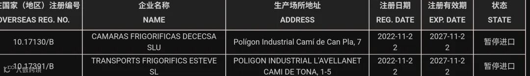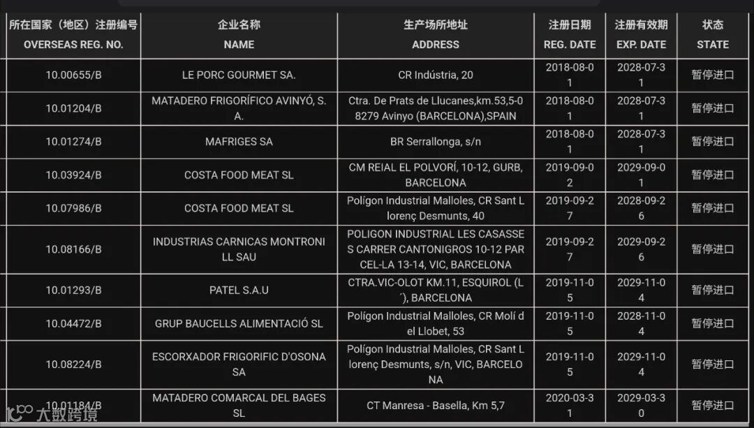 暂停受理西班牙12家猪肉企业(注册编码为:10.00655/B、10.01204/B、10.01274/B、10.03924/B、10.07986/B、10.08166/B、10.01293/B、10.04472/B、10.08224/B、10.01184/B、10.17130/B、10.17391/B、)自2025年11月28日(含)起启运的输华产品进口申报。