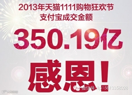 “双十一”即指每年的11月11日,由于日期特殊,因此又被称为光棍节。而大型的电子网站一般会利用这一天来进行一些大规模的打折促销活动,以提高销售额度。2013年11月11日24时,天猫“11·11”购物狂欢节支付宝成交额达350.19亿元,刷新去年“双十一”创下的191亿元的纪录。而其中,手机淘宝就占了惊人的53.5亿。