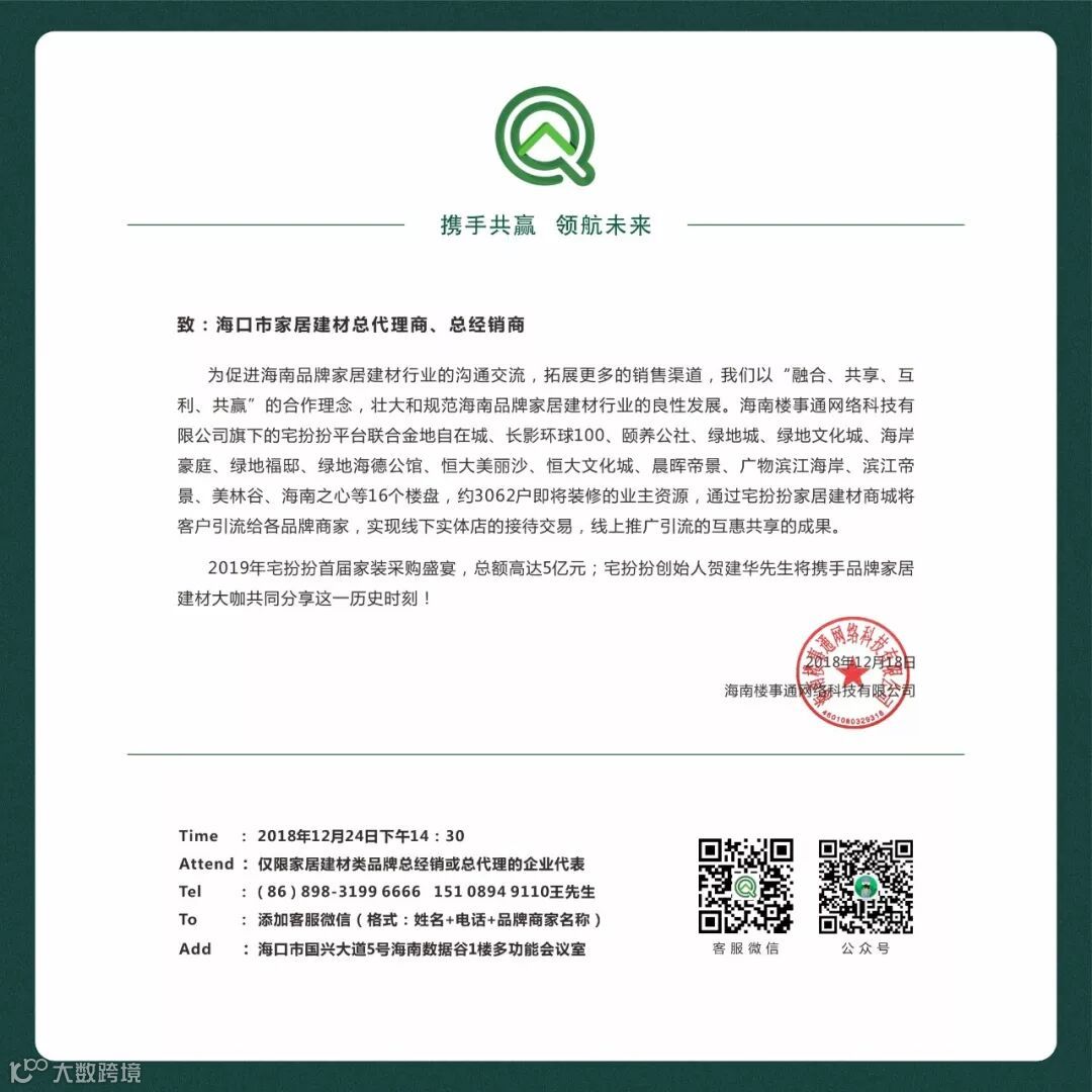 致:海口市品牌家居建材总代理商、总经销商