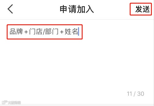 3、点击“申请加入”,填写申请理由“品牌+门店/部门+姓名”后点击发送。