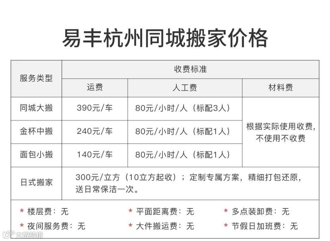 易丰搬家收费标准=起步价+人工费+材料费(不使用则不收费),下面以杭州同城搬家为例: