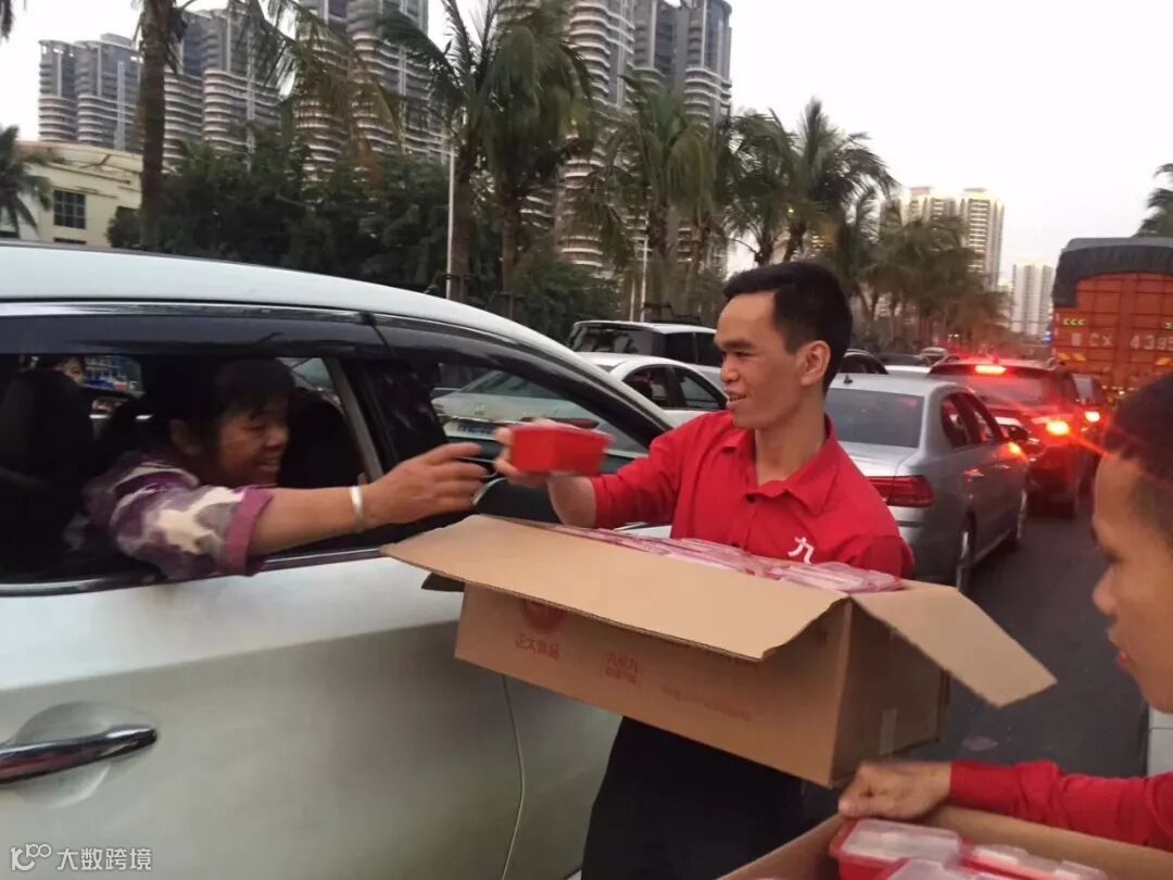 九毛九是一家有爱有未来的餐饮公司。一如二十年前,暴风雨袭击海口般,九毛九人依旧向群众伸出了爱心之手。这次海口九毛九为滞留秀英港的游客贡献出了一份温暖。小米糕、饺子、矿泉水……全部打包好送到被滞留的道路上,我相信这份爱心滞留的人群已经深深感受到了。
