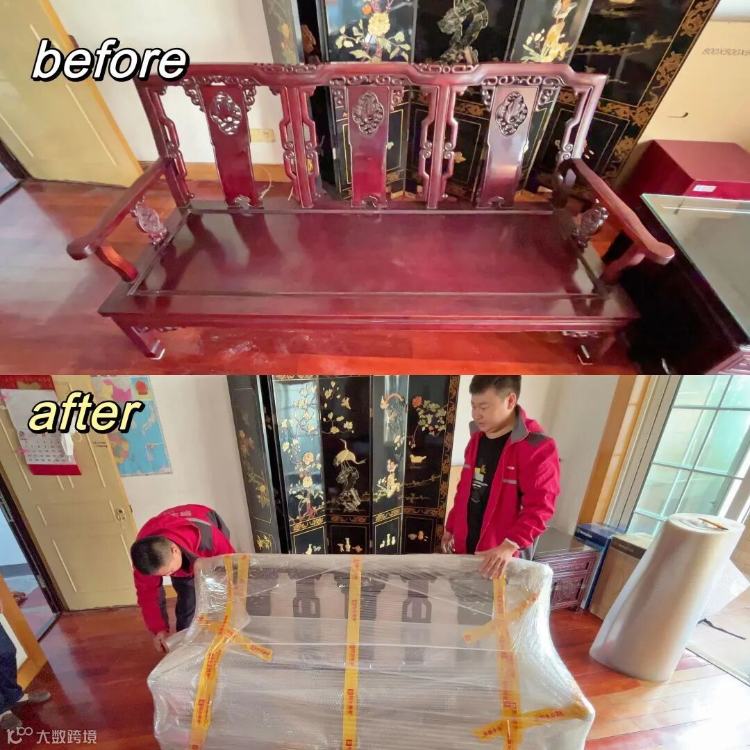 由于沙发是整体家具,不方便进行拆卸打包,所以师傅们选择直接整体打包。用气泡膜包裹沙发全身,靠背和扶手处重点加固防护,最后缠绕膜胶带固定即可。