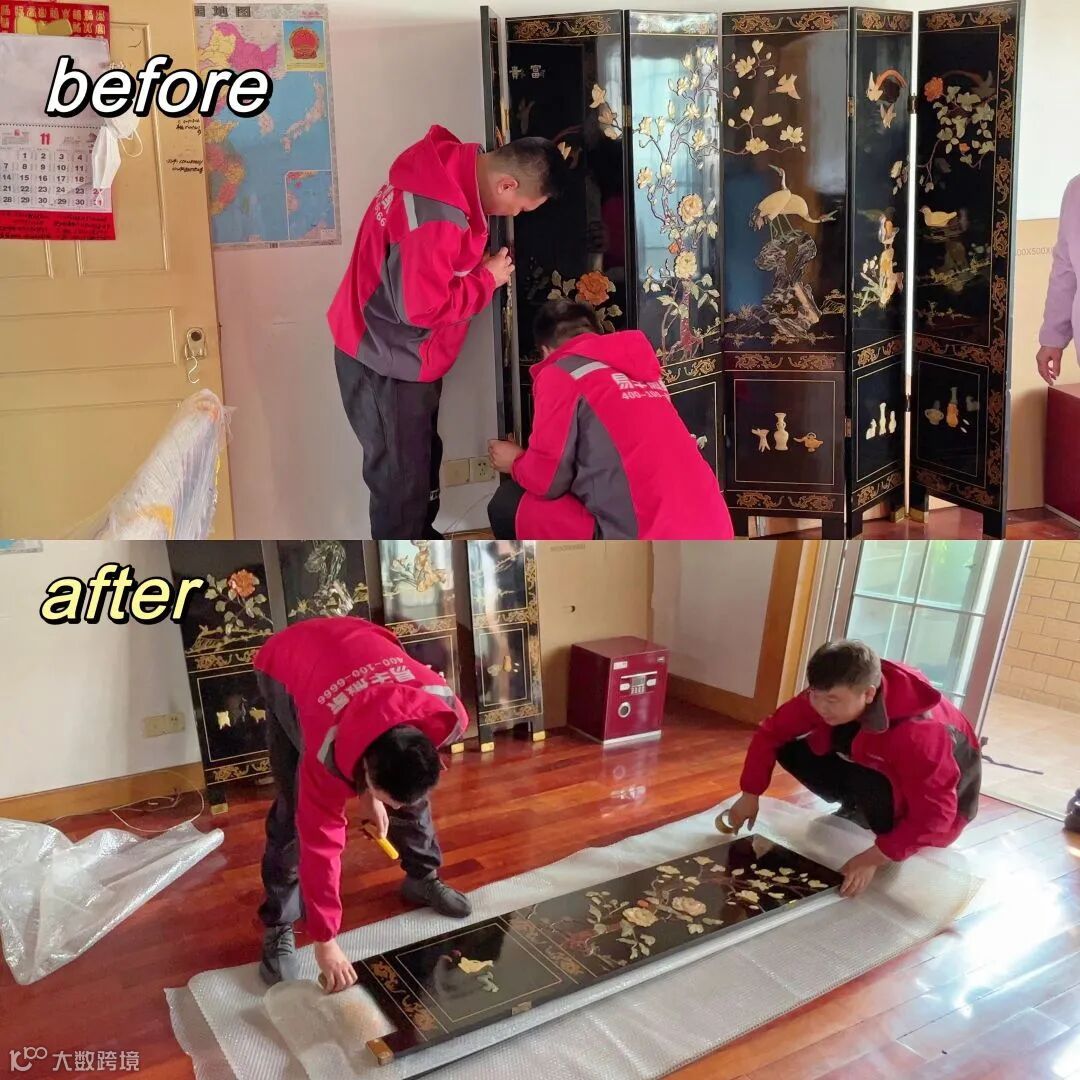 先用干净棉布将屏风表面擦拭干净,再将屏风一面面拆卸下来,拆卸下来的每块屏风挨个用气泡膜打包一遍,最后再整体打包在一起,方便后续还原工作。