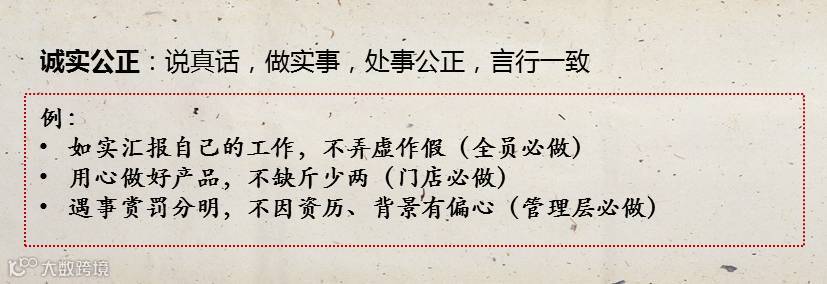有的人一开始能力一般般,但为人诚实正直,言行一致,责任心强,遵守各种法律、制度,最终做出惊人业绩,赢得同事认同和领导赏识,成为各家餐厅都想抢夺的人才。