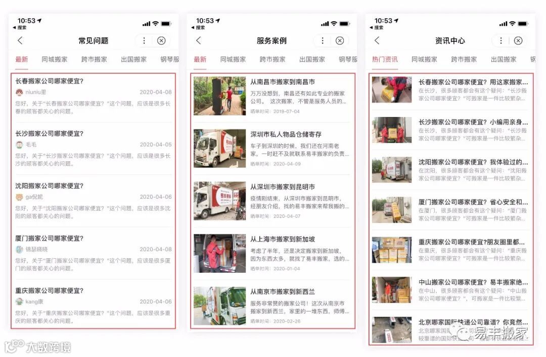众所周知,单纯用文字的表达太过于呆板、片面,而加入图片和视频就能让事件阐述更加生动。针对搬家过程中的问题,易丰搬家物流小程序在资讯中心、常见问题、服务案例等版块中,将文字介绍、图片分析和视频详解相结合,多感官还原搬家过程,具体案例落实到城市。同时,在小程序用户评价栏存储着近2万条真实评价,让消费者全面了解易丰搬家的市场口碑,方便其他用户在选择时做出判断。