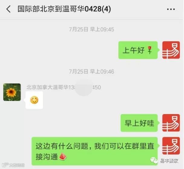 为了提高出国留学搬家的沟通效率,让整个前期工作更加顺利,易丰搬家在客户达成初步合作意愿后,会建立一个一对一服务的对接群,包含:客户、专属客服、国际部项目经理、操作员(清关、所需证件等对接)。