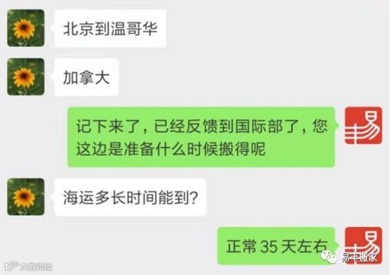 7.28日,搬家当天司机会将物品运输到易丰搬家的北京仓库里,国际部会订最近的一班船,将物品海运至加拿大。