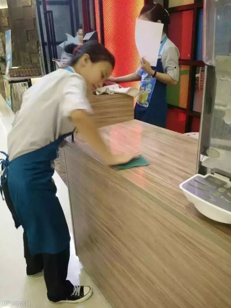 文文负责迎宾部的卫生,玻璃门被她擦得超明亮:无油渍、无指纹、无灰尘。擦迎宾台的态度都那么专注,就应该知道她将卫生搞得多干净了吧!▼