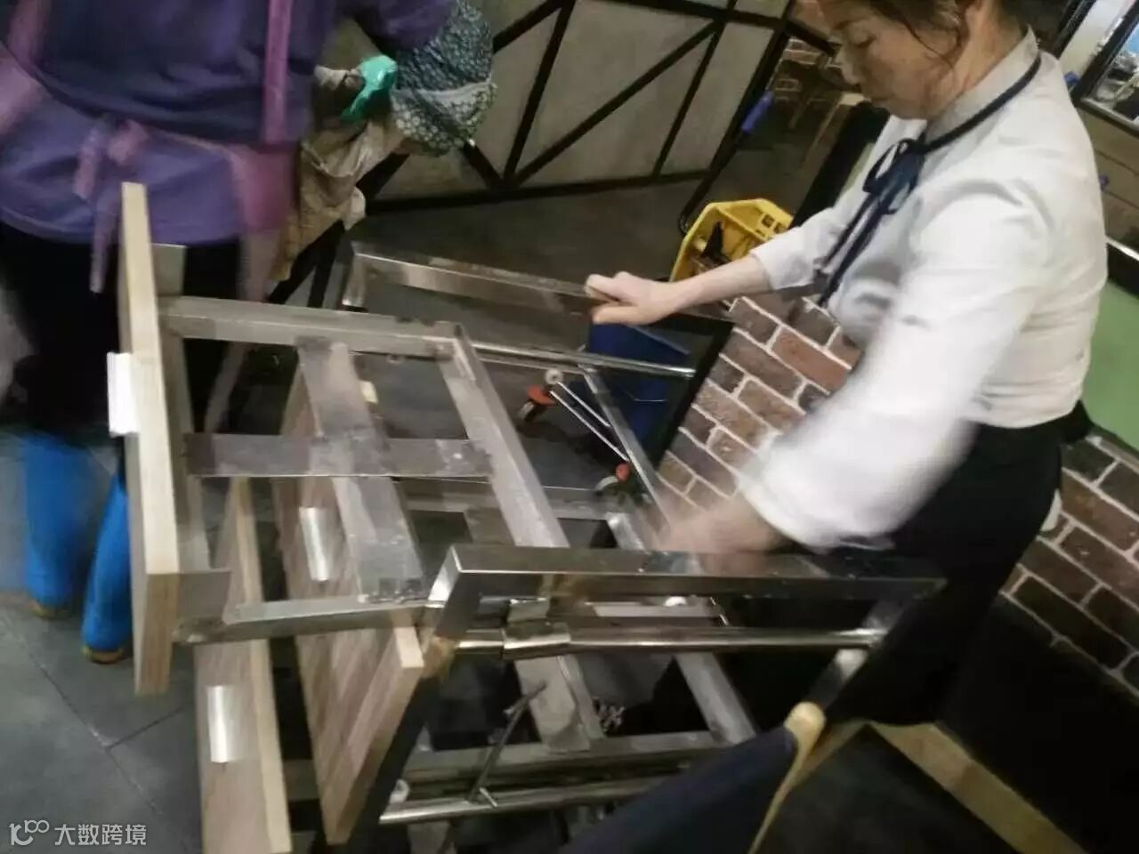 小伙伴们全心全意地投入到大扫除工作中去,50 多岁的楼杂阿姨也充满活力,充满激情。想知道阿姨有多认真细致?锃亮无油渍的餐车就是最好的证明。