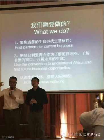 参加长江商会和尼日利亚商会的商业洽谈会,尼日利亚是非洲经济增长最快的国家,人口1.3亿,再加上西非经济共同体2.8亿人口,中国有发达的制造业,尼日利亚有丰富的矿产资源(原材料石油,天然气,木材,矿产资源,农产品),可以向尼日等非洲国家出口工业产品和农产品,这次交流会只是双方交流会的一个开始,今后还有一系列重要活动,会有更多的交流活动,可以让双方的交流达到更深的层次。