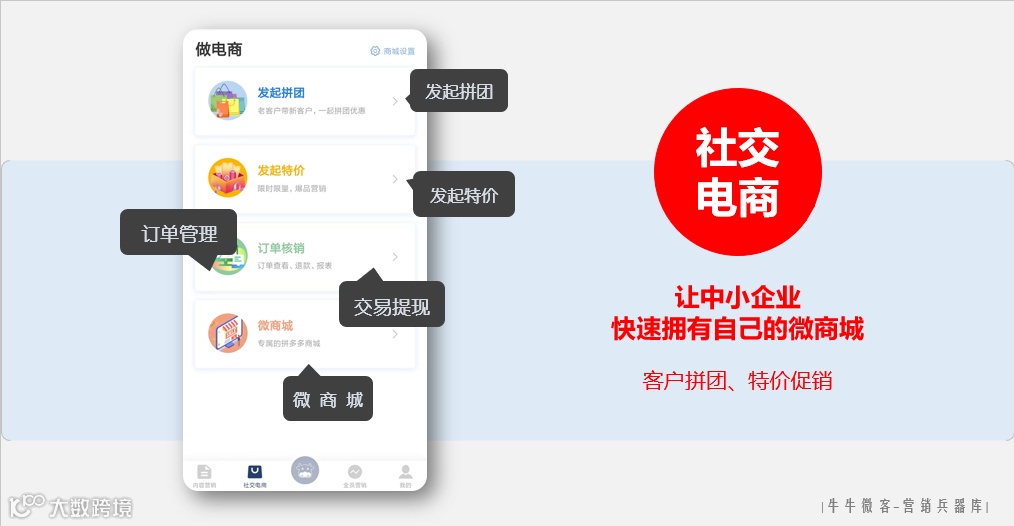 牛牛微客自带拼多多商城功能,一键发起拼团,一键发起特价,交易提现以及整个微商城功能,这些功能全部免费开放给每个企业,不收佣金,让每个中小企业都能通过牛牛微客,从零开始做电商!