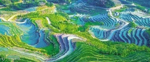 俯瞰下的五指山牙胡梯田色彩斑斓,气势恢宏。