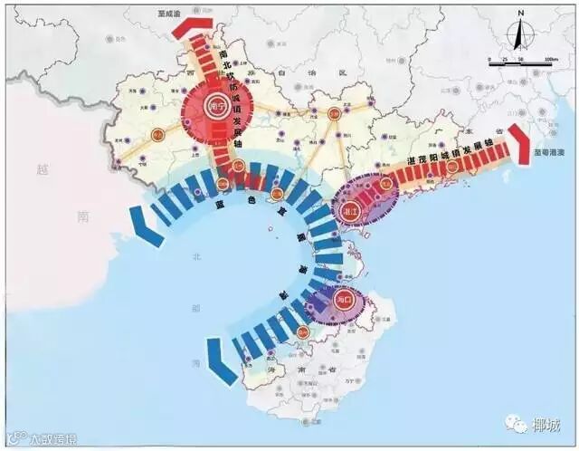 2017年2月17日,广西、广东、海南三省区在广西南宁联合召开《北部湾城市群发展规划》新闻发布会并宣布,面向东盟,服务“三南”(西南中南华南),以南宁、湛江、海口为中心共同建设宜居宜业的蓝色海湾城市群。