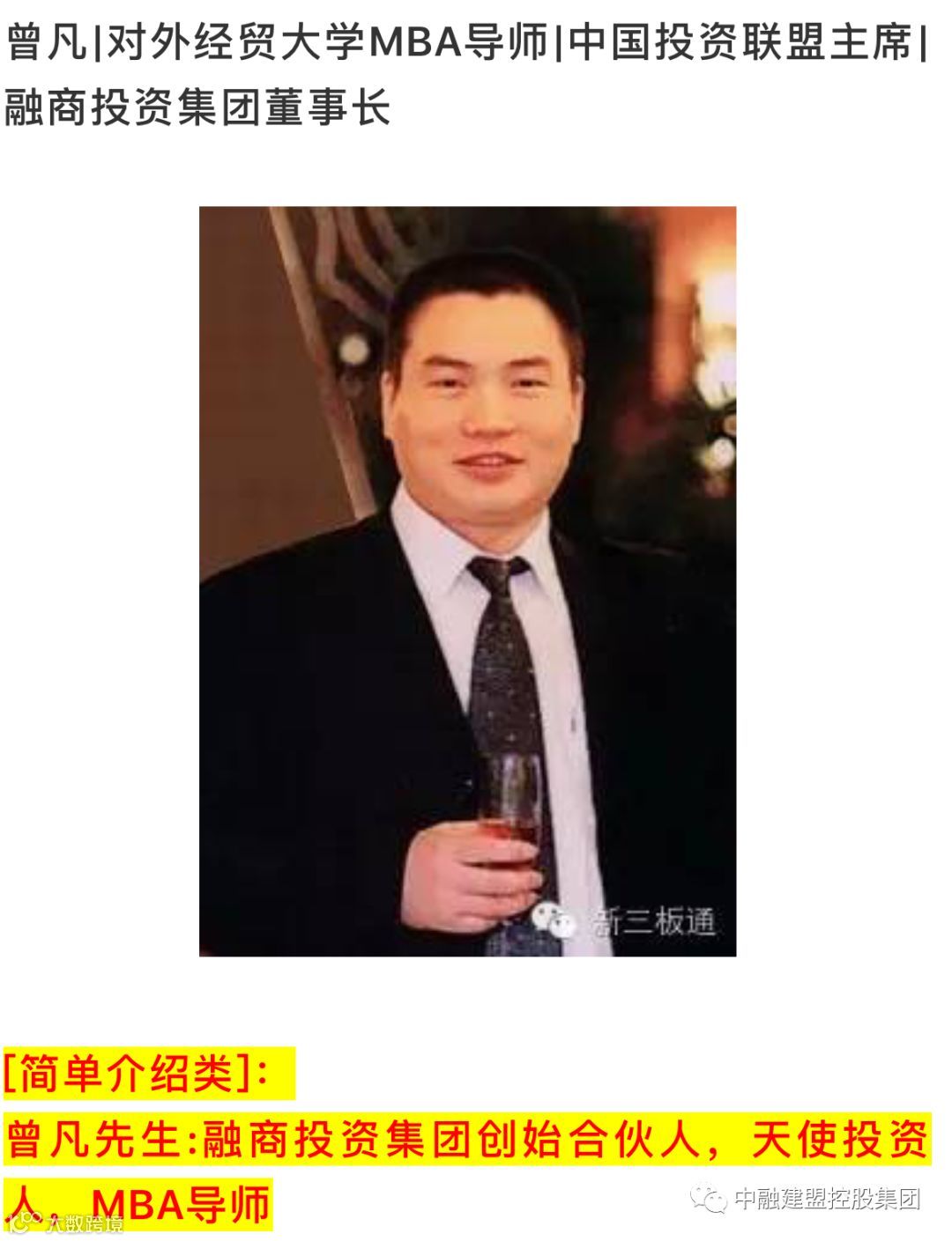 曾凡简介:曾凡因成功投资“全球第一人数组合”、“五十六朵花少女偶像组织”(该节目在央视、 各地方台、新浪网、搜狐视频、新华网、香港卫视、凤凰卫视等上百家媒体进行了大量的报道。)而一举成名,从2011年起,他用5年时间,投资或创建了16家企业,是当代中国非常激进的天使投资人和风险投资专家。他曾先后在美国某上市公司、国有大型企业及国内上市公司担任重要高管。拥有多年外商独资、大型国有企业、上市公司的工作管理经验,对企业战略、企业重组并购、投融资业务、企业上市等具有成功实战经验。曾先后主导并成功运作收购美国某石油公司、并购及反向并购美国某电气企业、国内企业等几十个并购、投融资及上市项目。投资并创建了数家企业,同时被多家企业聘为“战略投资高级顾问”及“投资专家”。