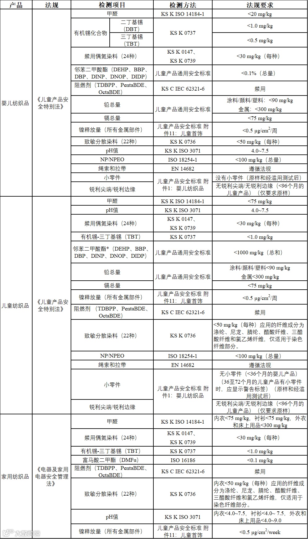 出口韩国纺织服装企业须关注婴儿纺织品和儿童纺织品的安全检查和安全确认标志,婴儿纺织品、儿童纺织产品和家用纺织品的限量指标和检测方法,特别是阻燃剂、有机锡、重金属、NP/NPEO、富马酸二甲酯、有害磁体、金属部件的镍释放等我国纺织服装强制性标准未进行规定的项目。