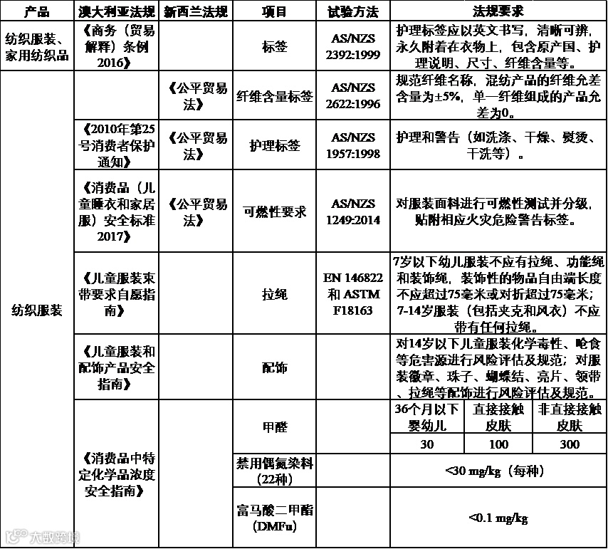 澳大利亚纺织服装相关法规由竞争和消费者委员会 (ACCC)负责执行,纺织服装安全标准由澳大利亚标准协会(SA)制定发布,进口纺织服装由边防局(ABF)放行。