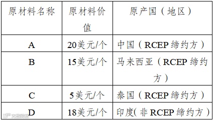 例如,中国生产的称重机X(FOB价58美元/个), X的原产地标准为“区域价值成分40%或品目改变”。所使用的原料如下: