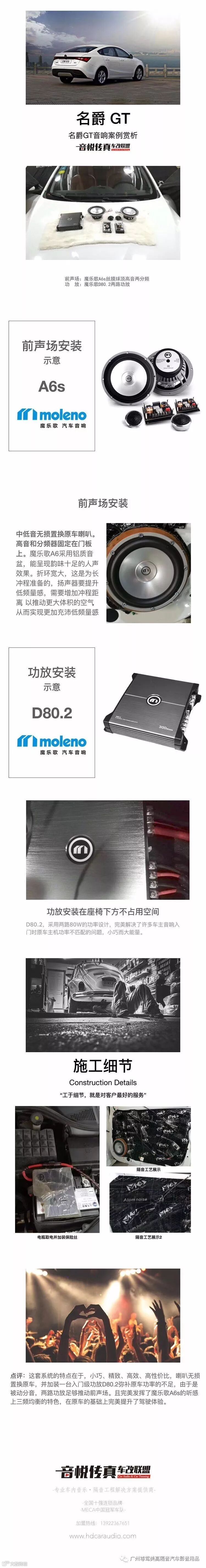 导读:音悦传真车改联盟-常州道声旗舰店出品:车 型:名爵GT前声场:魔乐歌A6s两分频套装喇叭功 放: