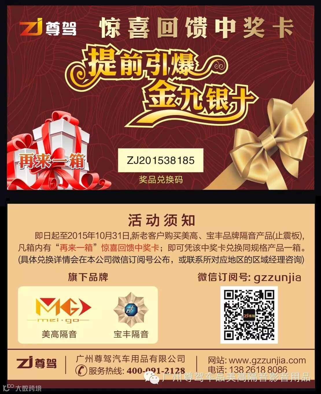 即日起至2015年10月31日,新老客户购买美高品牌隔音产品(止震板),凡箱内有“再来一箱”惊喜回馈中奖卡的,即可凭该中奖卡兑换同规格产品一箱。 (兑换详情会在公司微信订阅号公布,或联 系所对应地区的区域经理咨询)