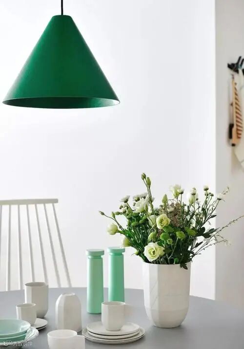 除了墙面的大面积绿色运用,在一些小物的选择上,一抹清新的绿色,也能成为点睛的一笔。白色的墙面搭配各种饱和度的绿色,带来或简约或清新的清凉感受。陶瓷花瓶组合,是否让你想到了清甜的冰激凌?