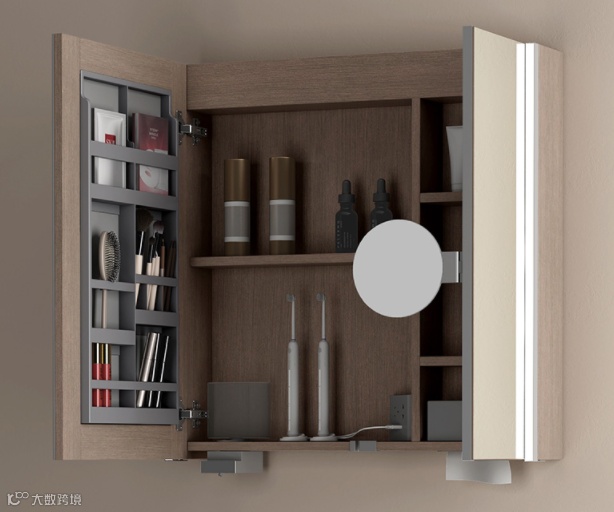 是美妆镜亦是收纳柜,内设多层置物架,分类归置有序收纳,取用一目了然;合上柜门封闭空间,避免浴室潮气、灰尘入侵,防水防潮储物更安心。