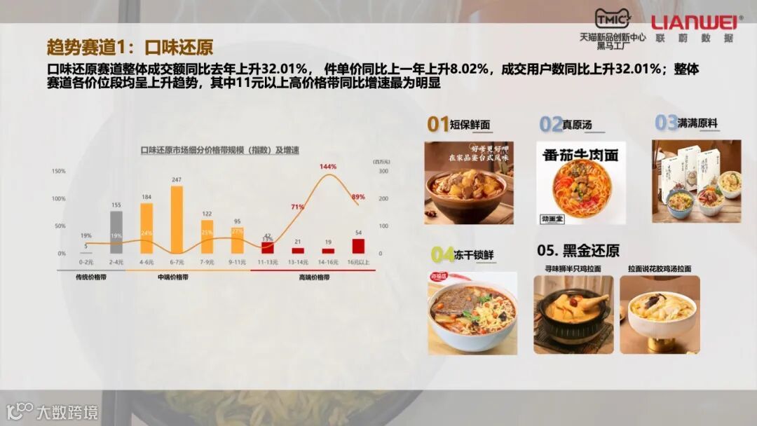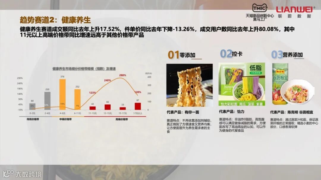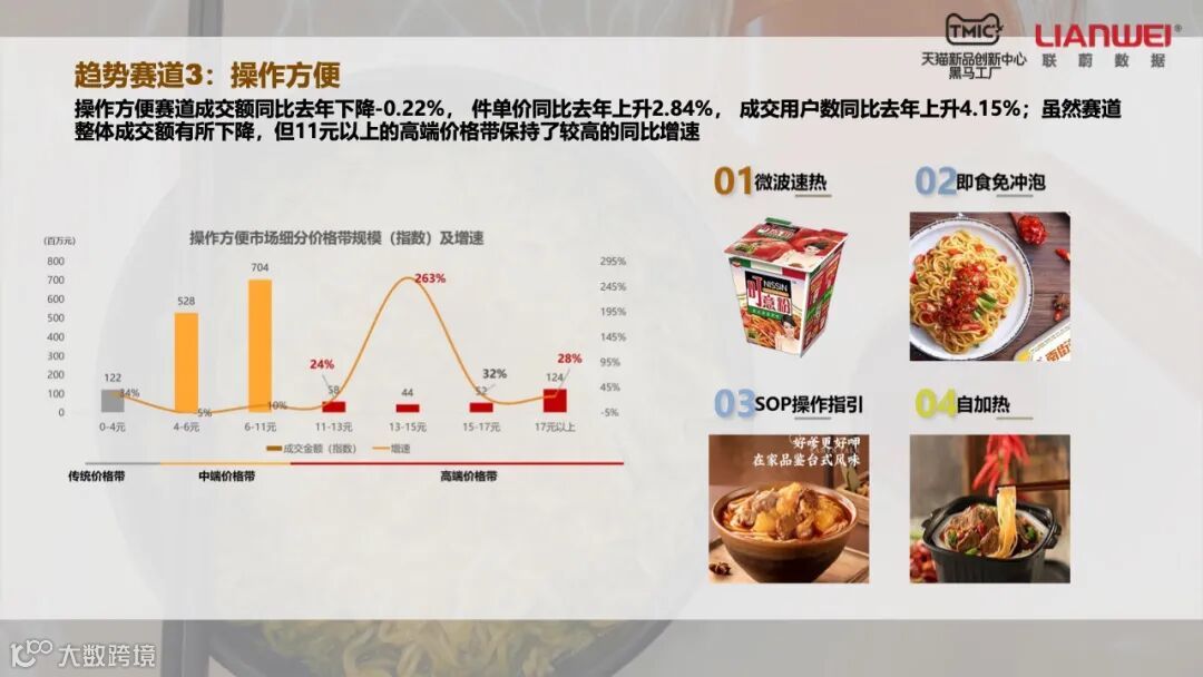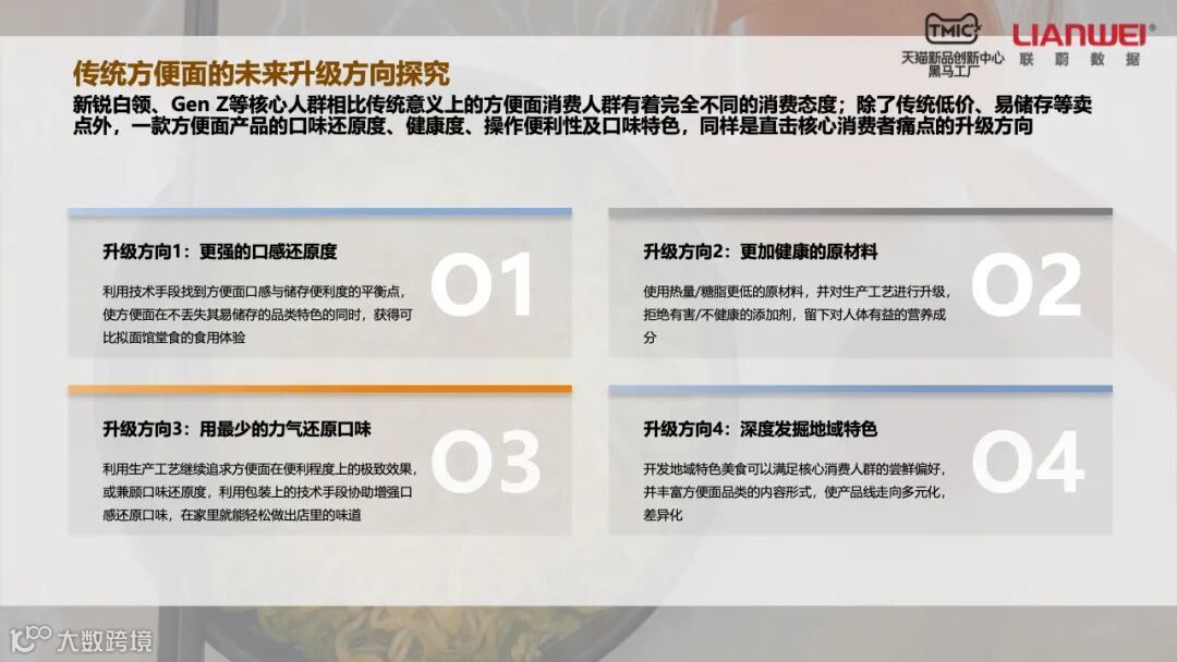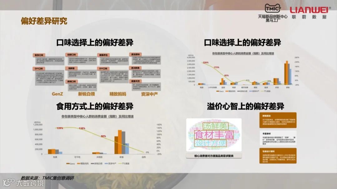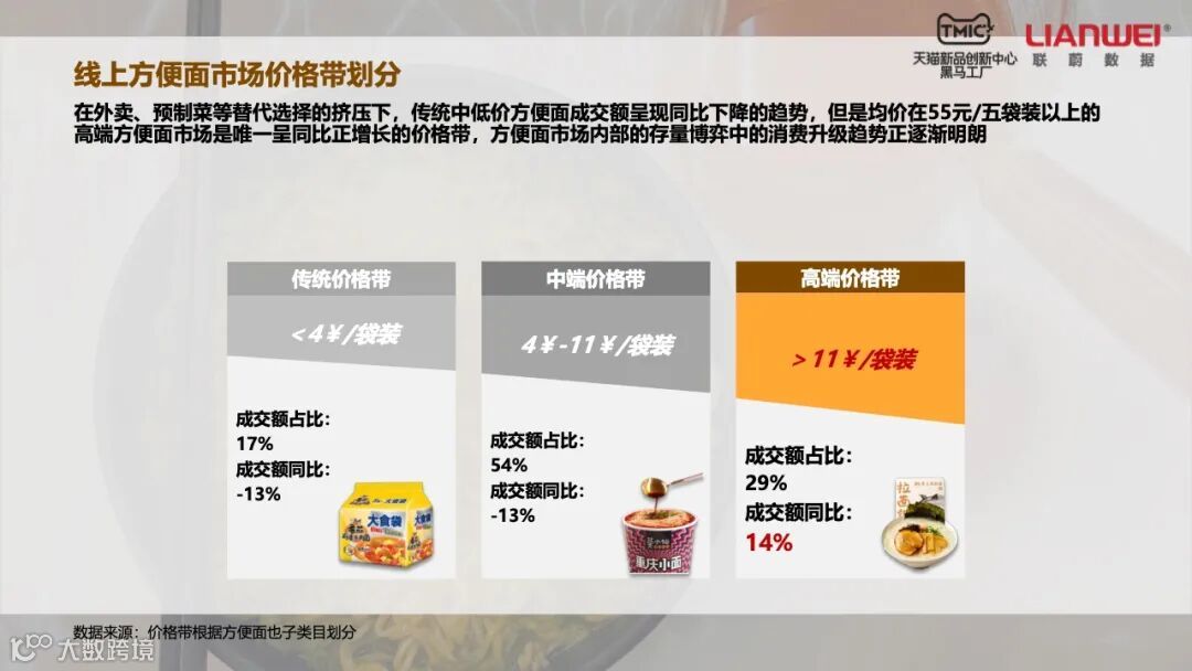 通过平台数据,方便面产业可以精准定位消费群体。尽管外卖行业的迅速发展让中低价位方便面销量不断下滑,但Z世代人群、精致妈妈、新锐白领和资深中产对高端方便面的消费并没有停滞。特别是精致妈妈和资深中产两个消费群体,前者占方便面消费人群的17%,后者占12%。他们对于中低价方面的需求大幅下降,但消费高端方便面的金额都在增长。